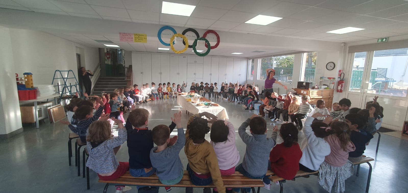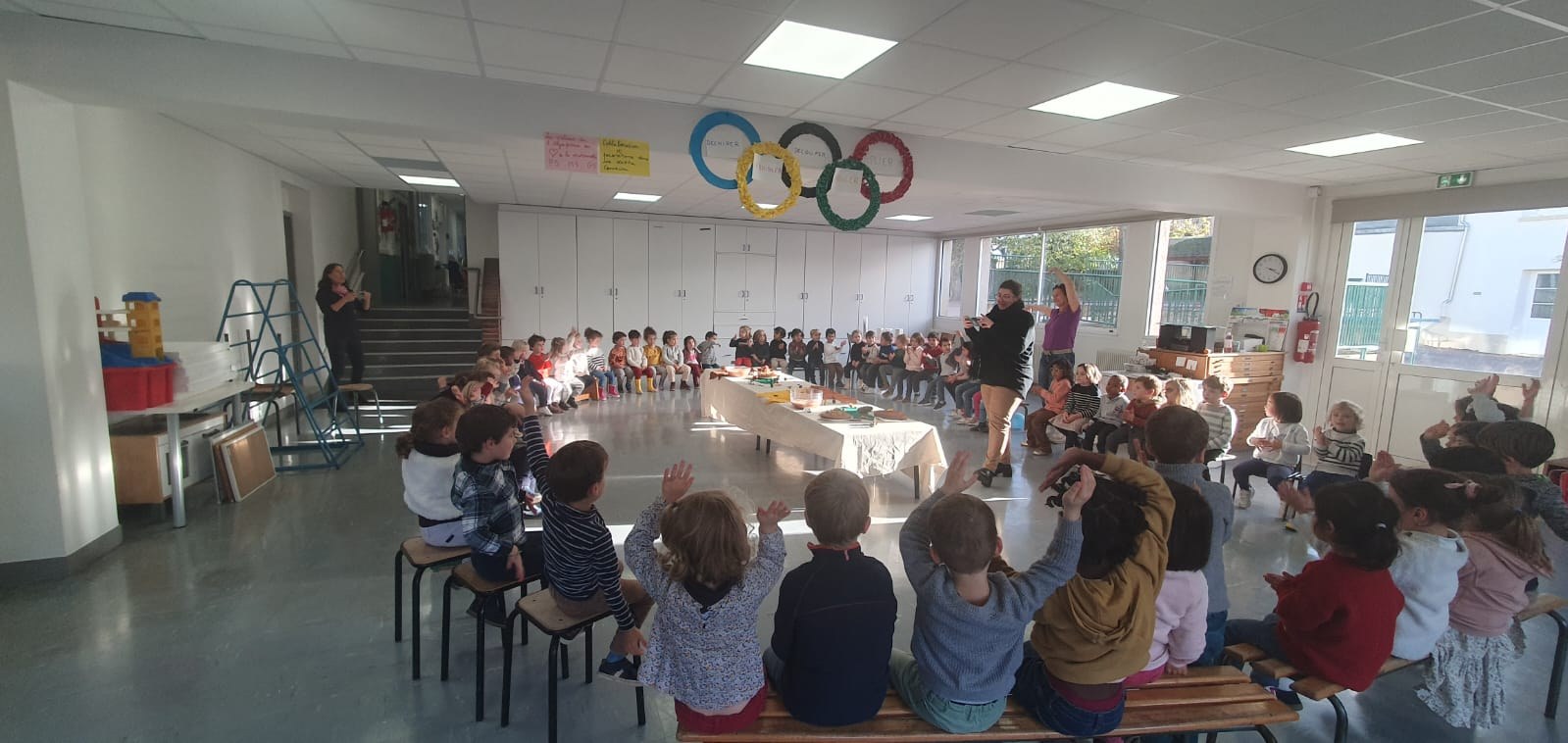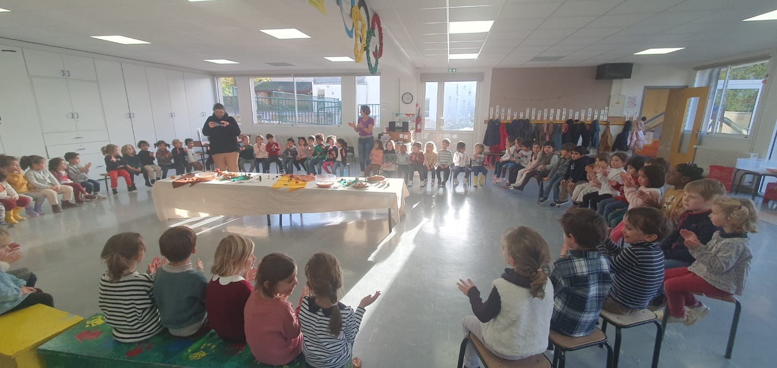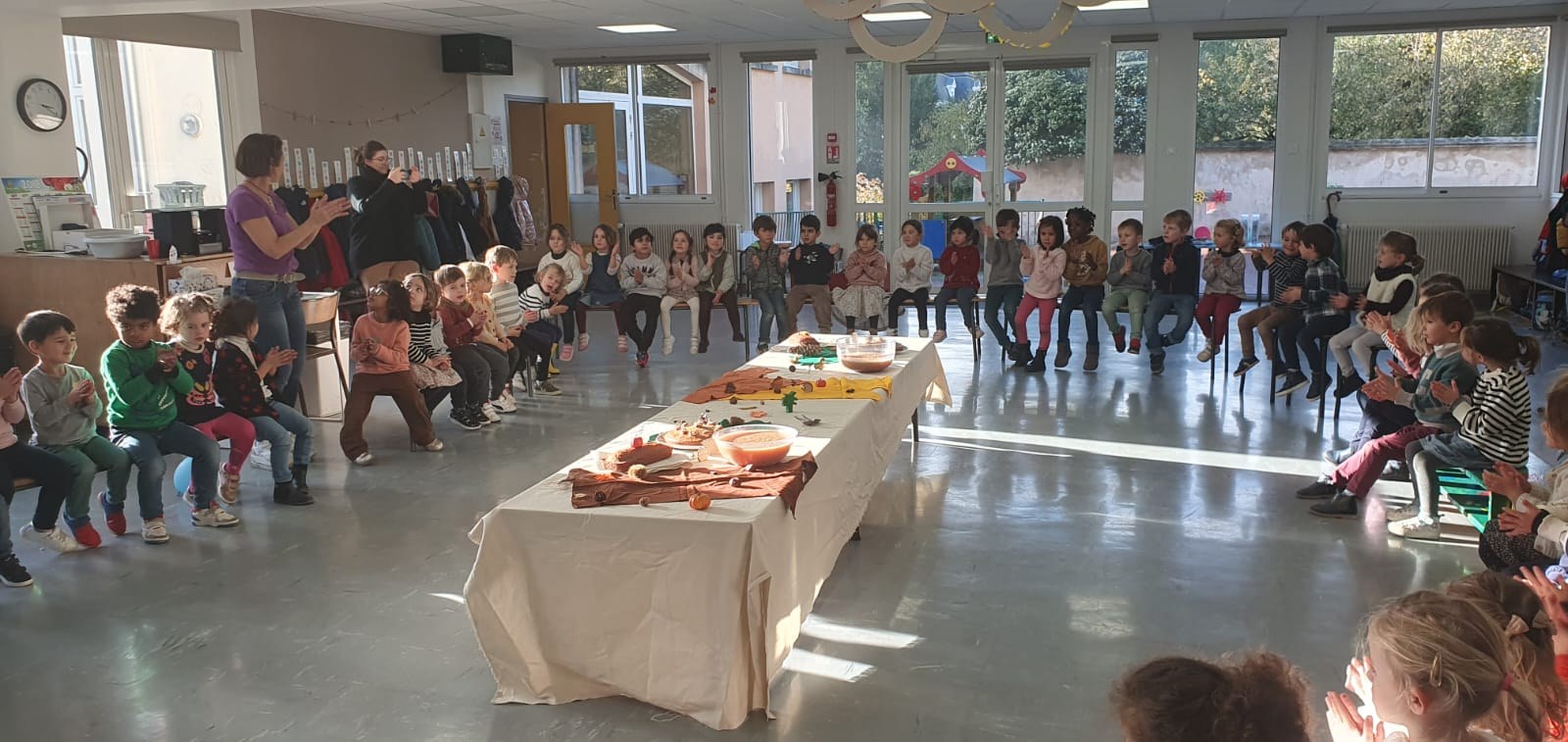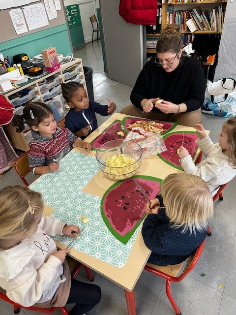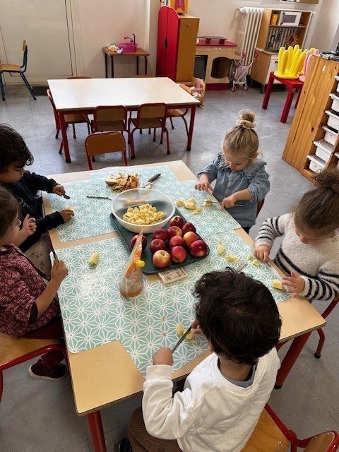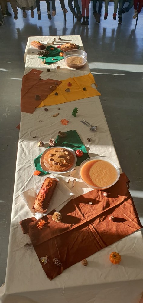 Vendredi 10 novembre, après avoir participé à des ateliers de cuisine dans leurs classes le matin : compote de pomme pour les PS, gâteau aux noix et châtaignes pour les moyens et pain d'épices pour les grands, les élèves de maternelle ont eu la joie de partager tous ensemble les mets qu'ils avaient confectionnés lors d'un goûter aux couleurs de l'automne ! Un vrai régal !